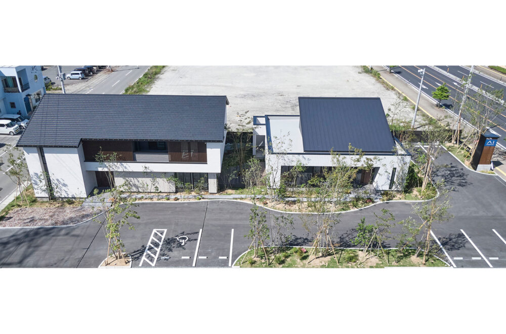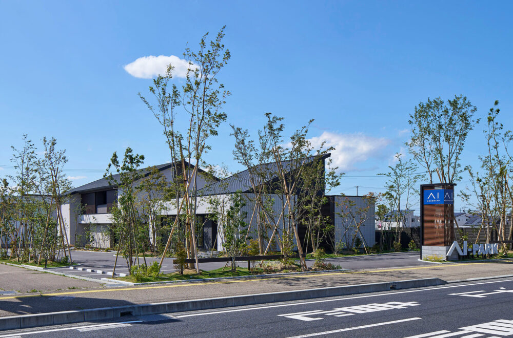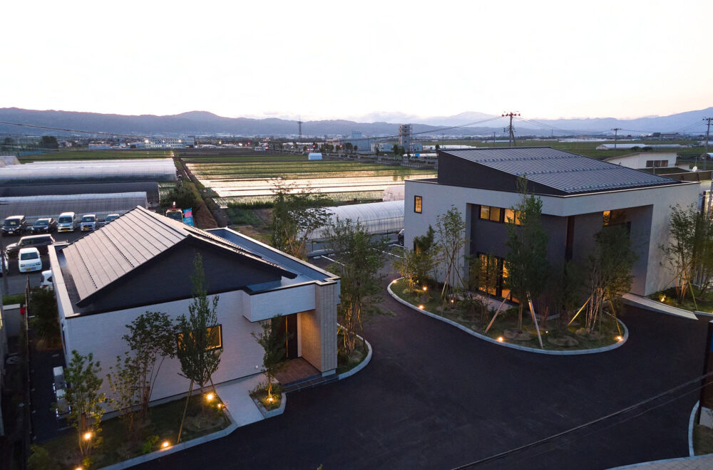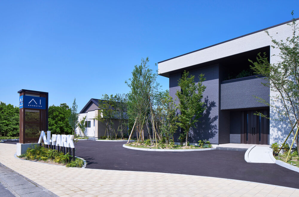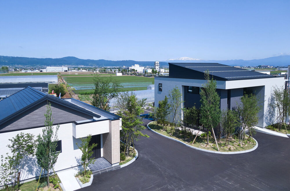 東北中央自動車道「山形中央IC」の東、「西田」交差点の南西にある「アイパーク山形」は、バーチカルスペース/タテを活用した2階建てと平屋の2棟が建つ複合型住宅展示場。