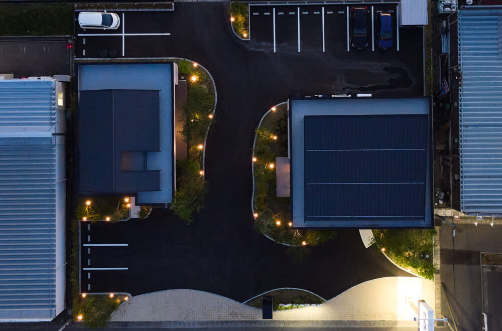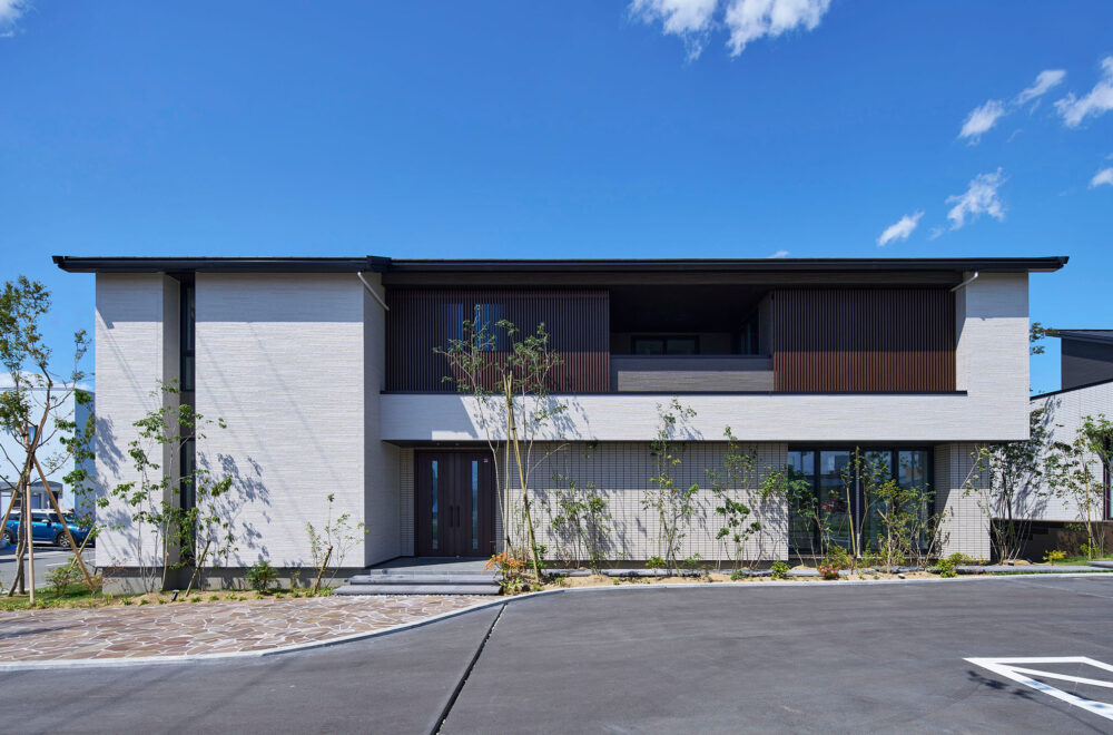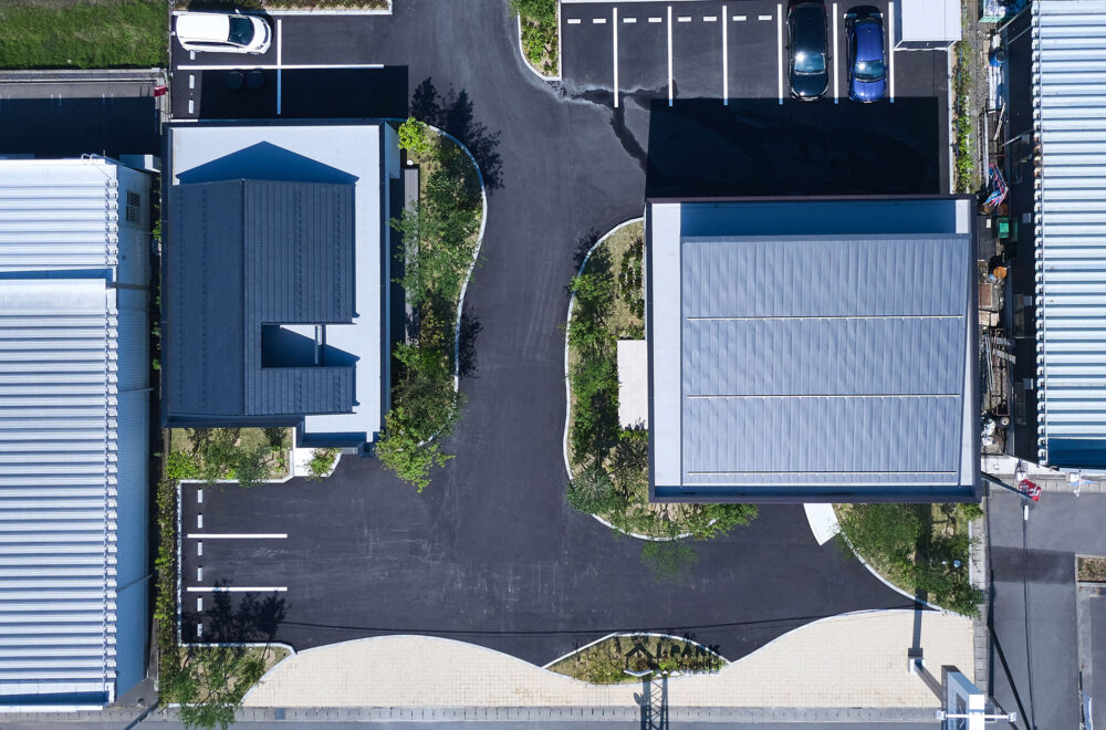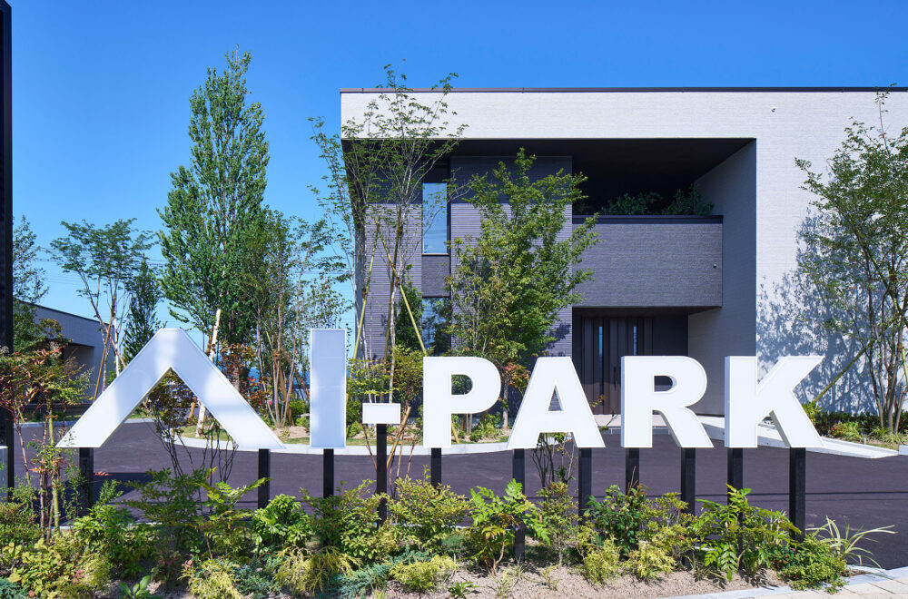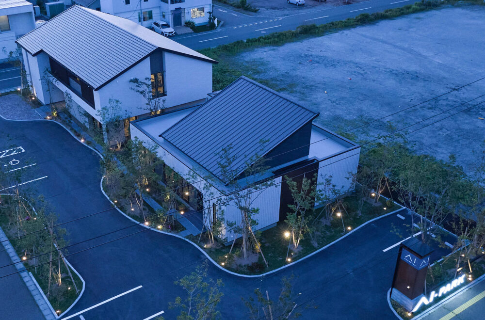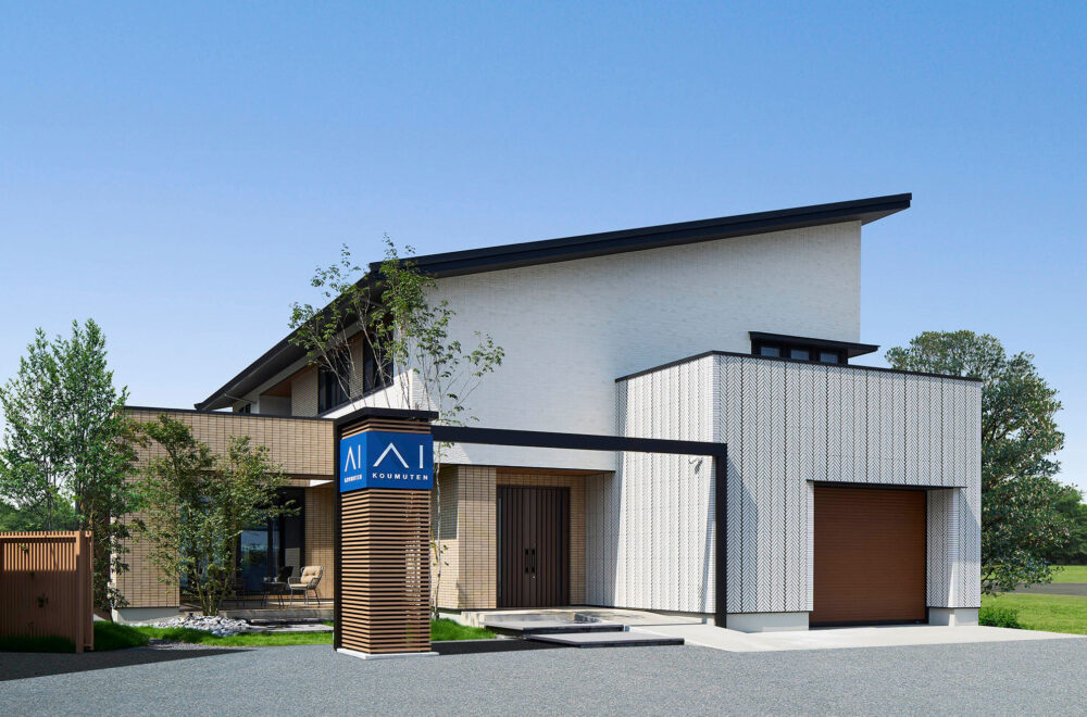 東北中央自動車道「山形中央IC」の東、「西田」交差点の南西にある「アイパーク山形」は、バーチカルスペース/タテを活用した2階建てと平屋の2棟が建つ複合型住宅展示場。