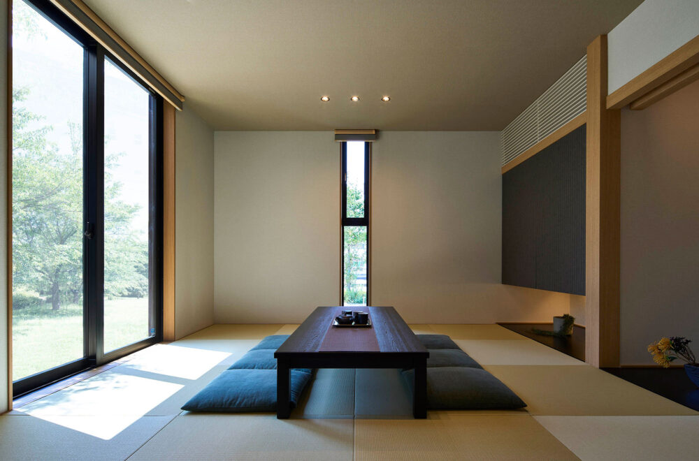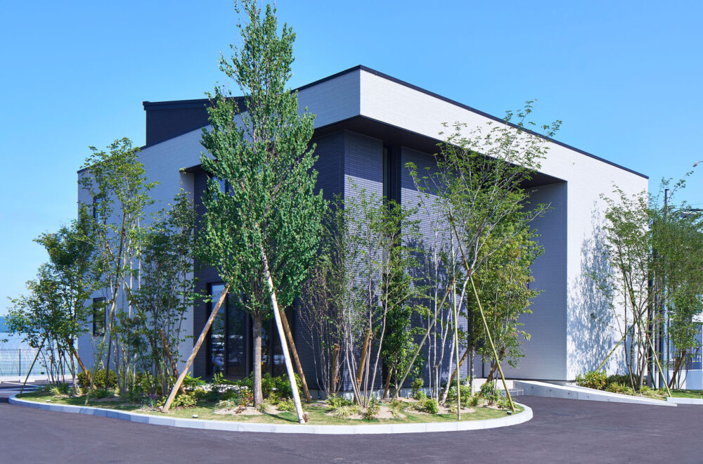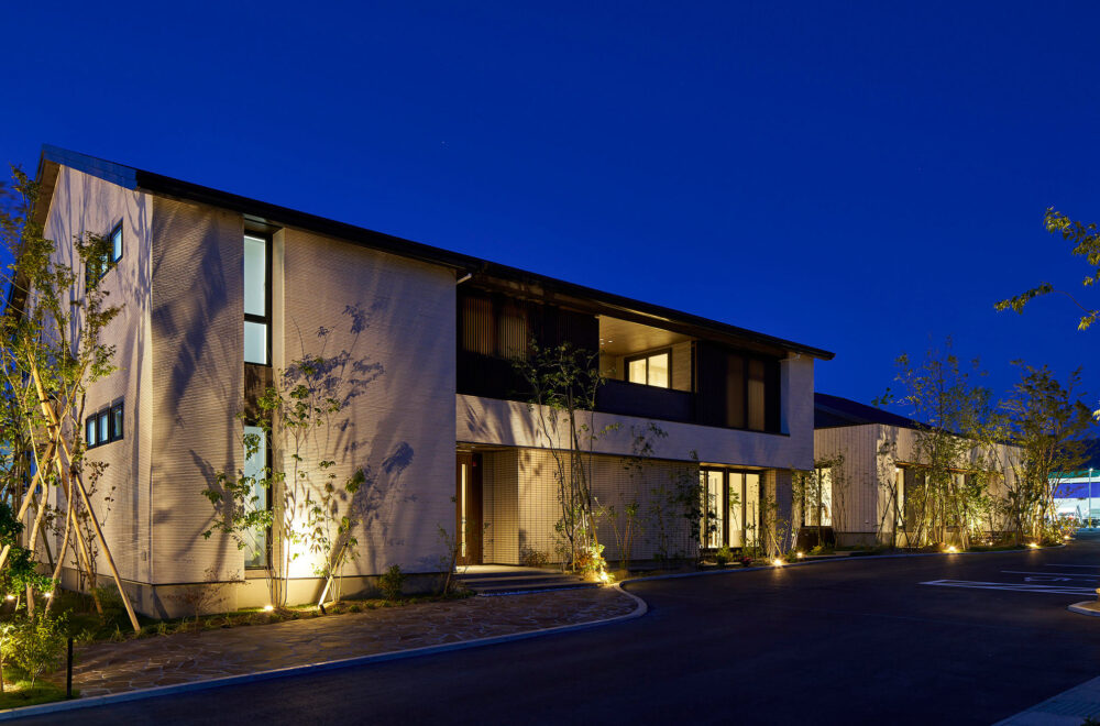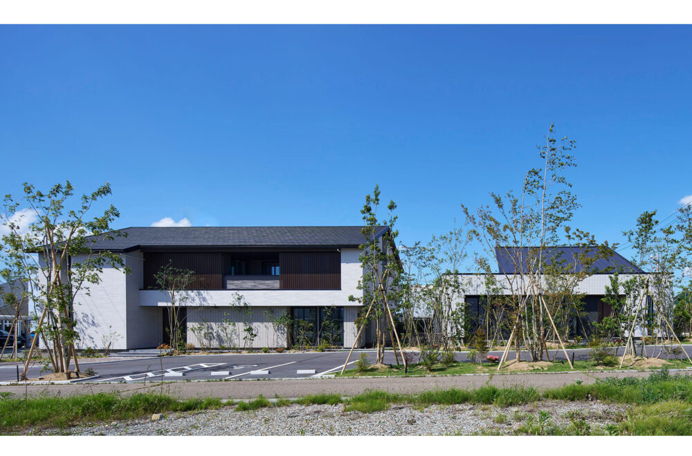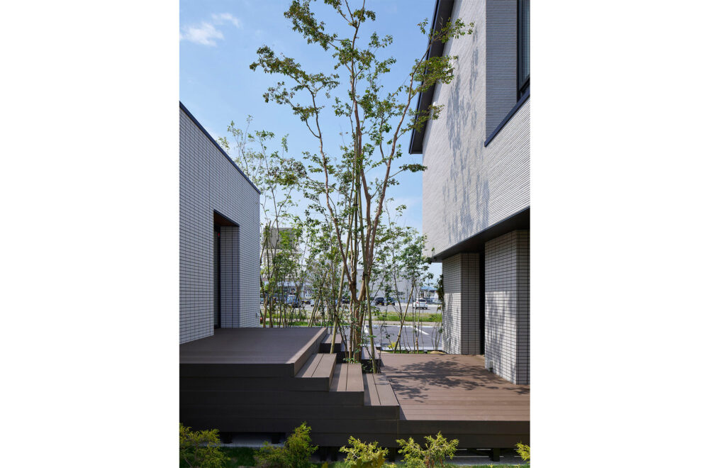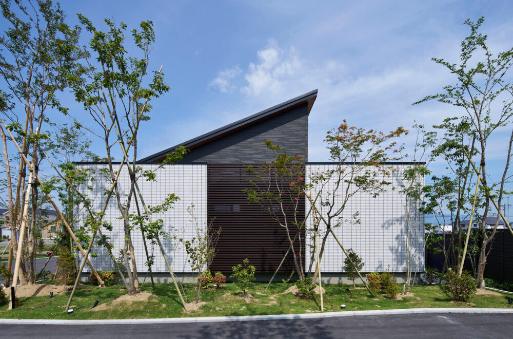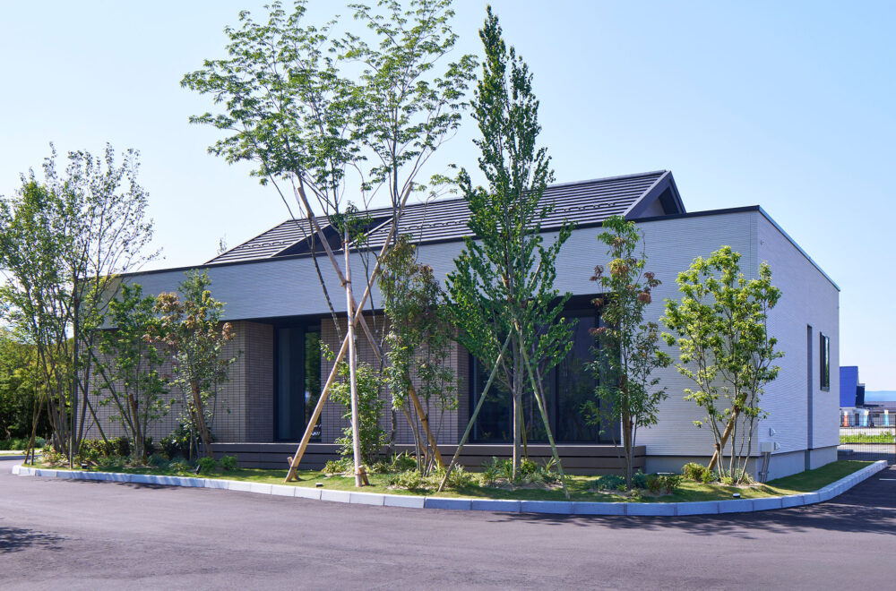 木々が揺れる広い敷地に、縦空間を活用してゆとりを生み出した1.3階のある平屋と2.5階建てが建つ複合型住宅展示場です。