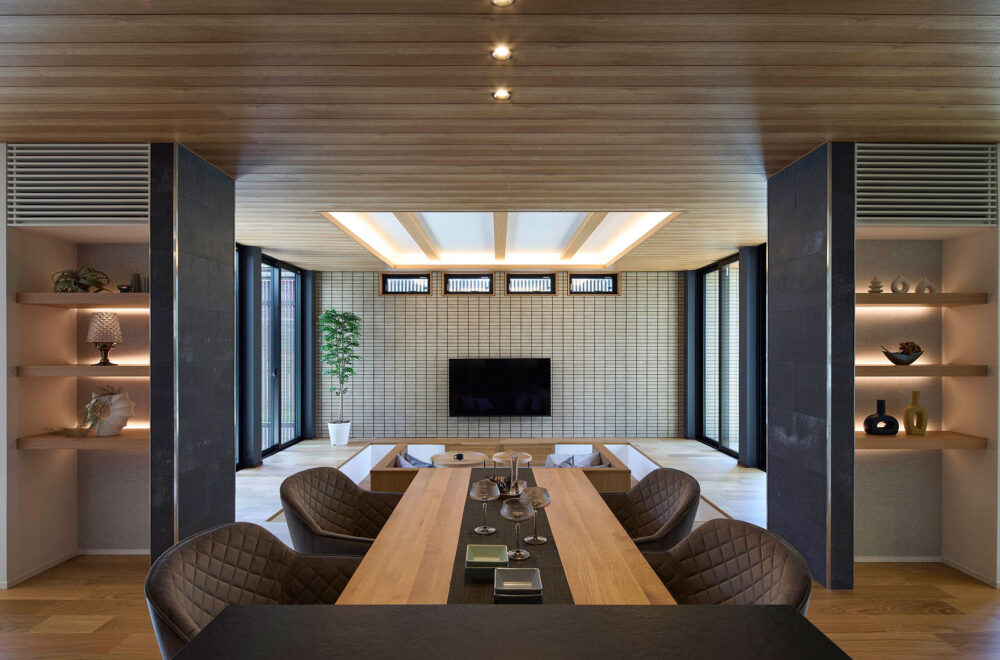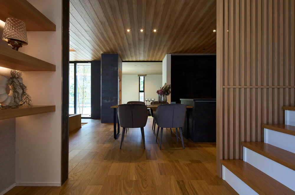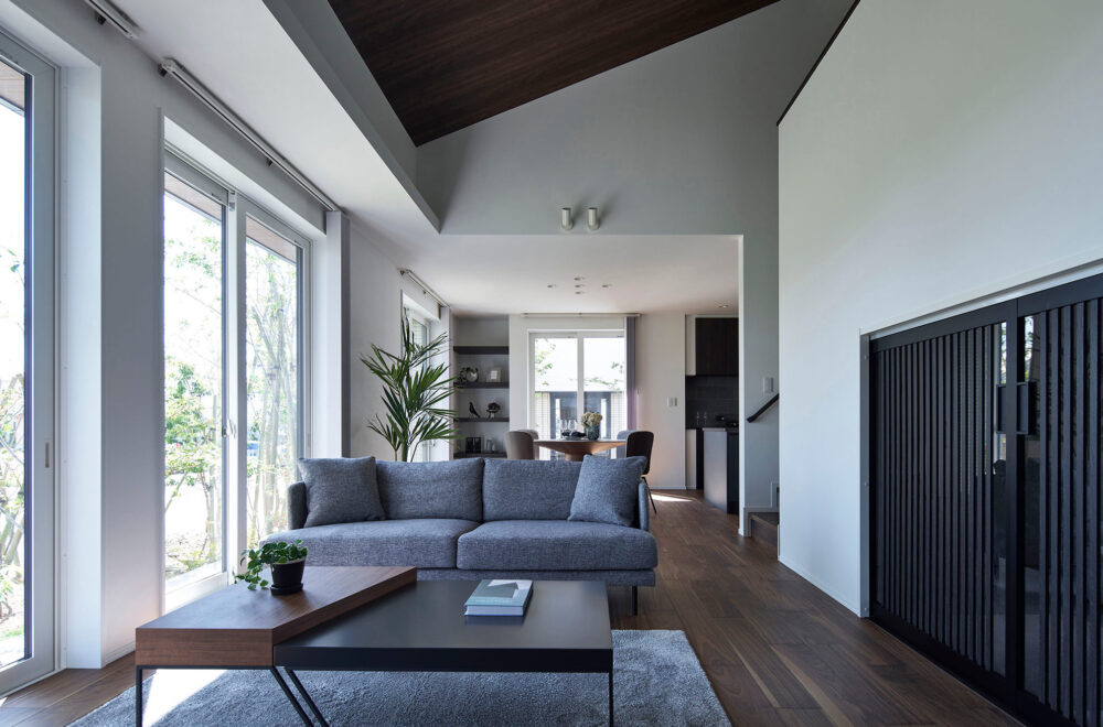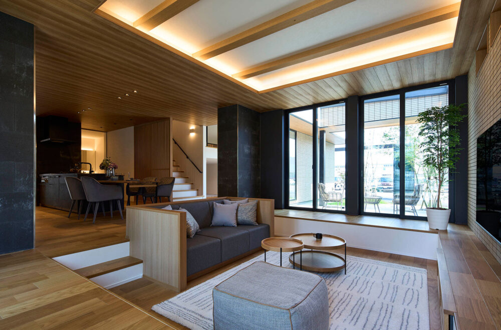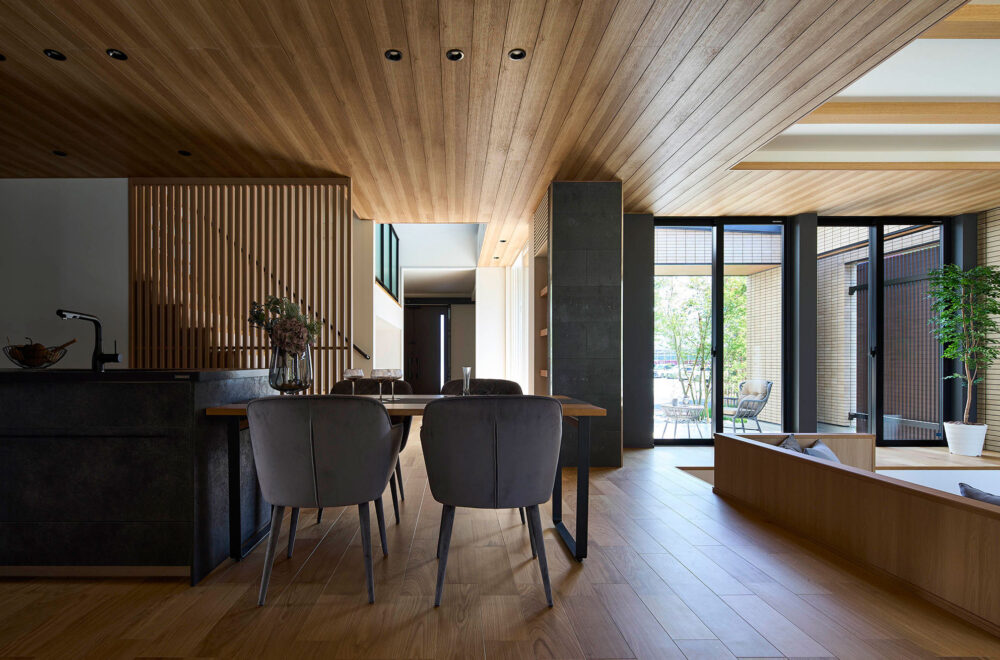 大きな片流れ屋根も印象的。木の質感を存分に生かしたLDKは、折り上げ天井とダウンフロアを採り入れたリビングが落ち着きと開放感を漂わせています。