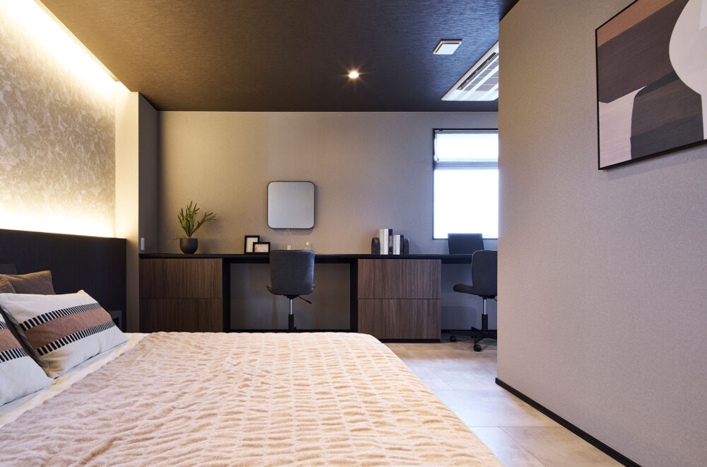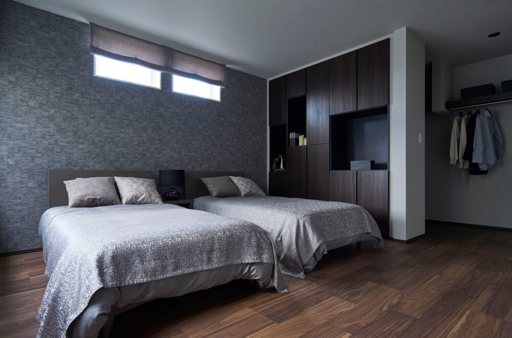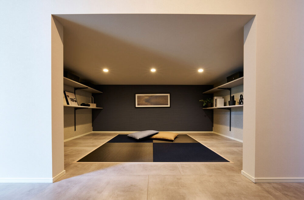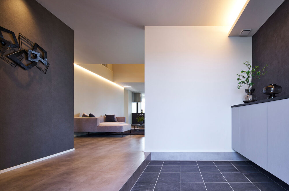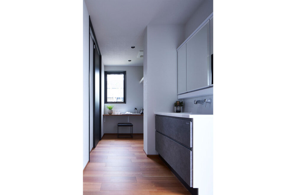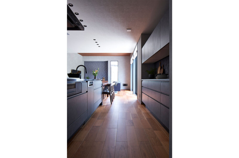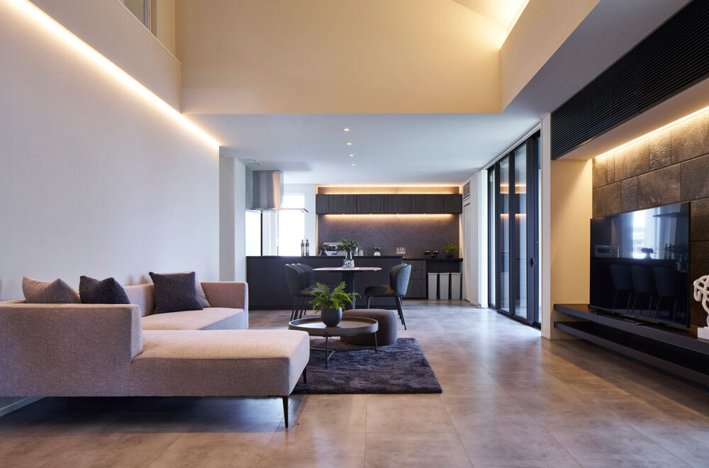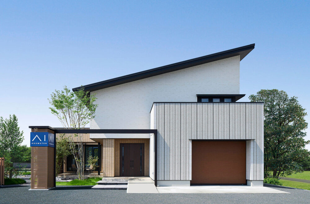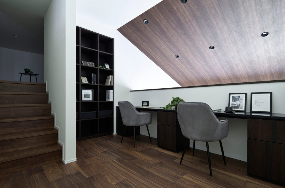 濃淡を効かせた外観のカラーコーディネートが目を引く2階建ては、ハーフ収納やスキップフロアがあり、趣味スペースやワークスペースなどの使い方を提案しています。平屋は、ハーフ収納を中心にLDKから洗面、主寝室を通ってLDKへ戻る回遊動線を採用。小屋裏空間まで届く吹抜を配したリビングでは、平屋とは思えないほどの開放感を味わえます。