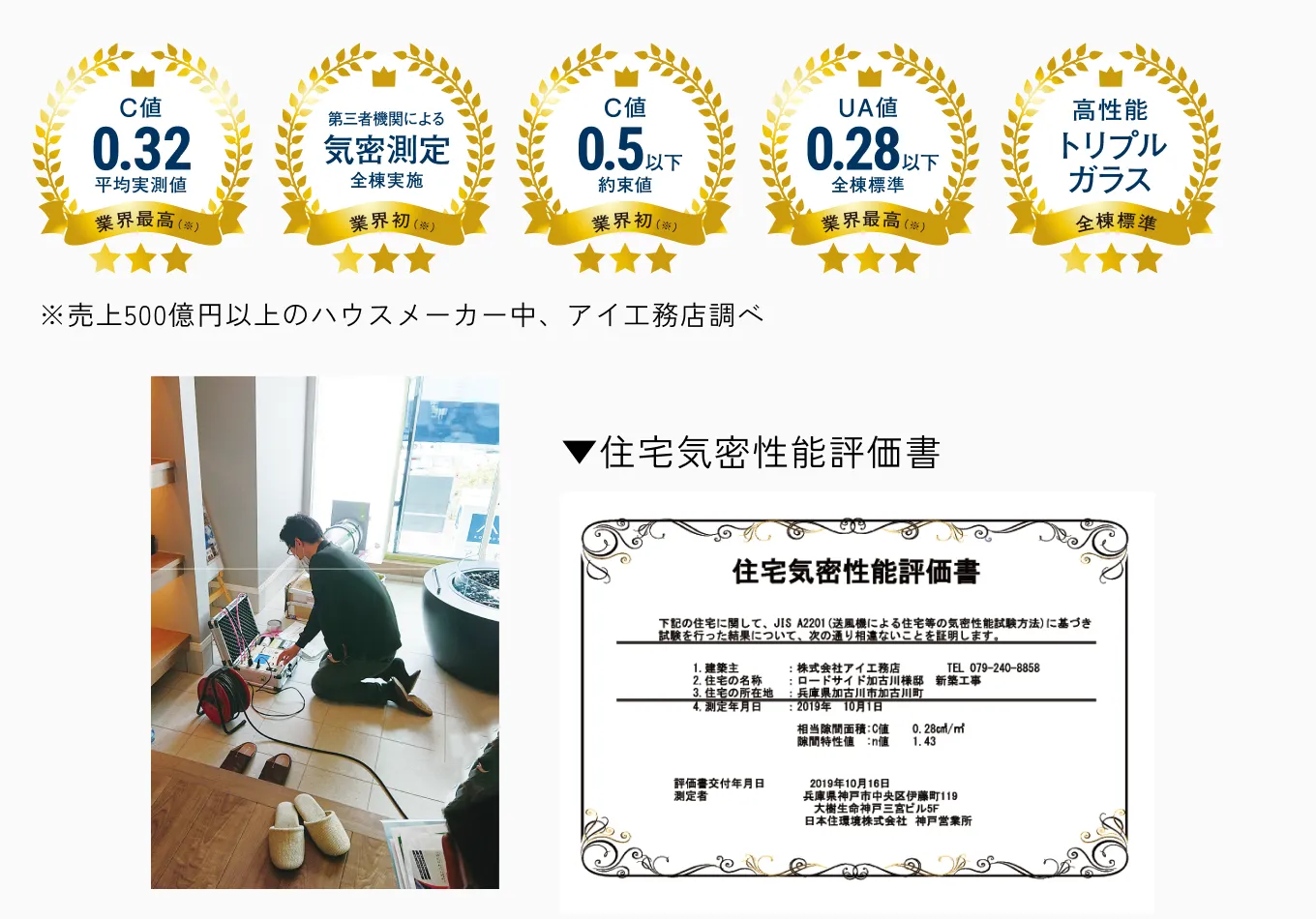 アイ工務店の住まいは、全棟でC値測定を行い、約束値0.5以下を保証。