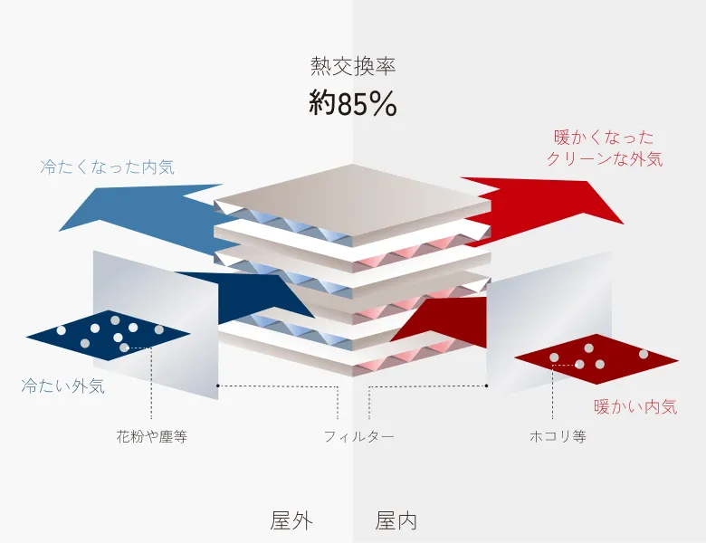 外気と内気の温度差を小さくしながら換気することで、一年中快適で新鮮な空気環境を保ちます。