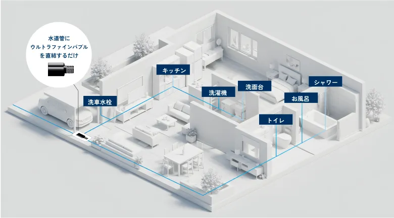 アイ工務店の住まいでは、水道管に専用機器を設置し、すべての水をウルトラファインバブル水に。
