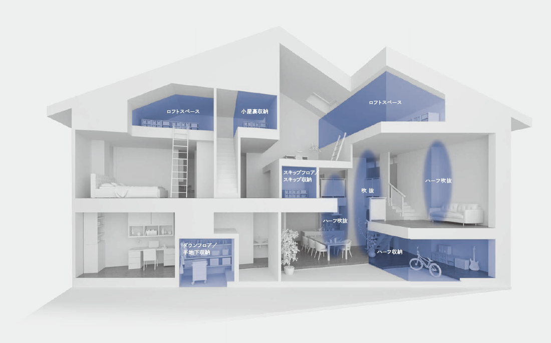ハーフ収納やスキップフロア、小屋裏収納など、住まいの中に高低差を創り出すことで生まれるアイデア空間も豊富。